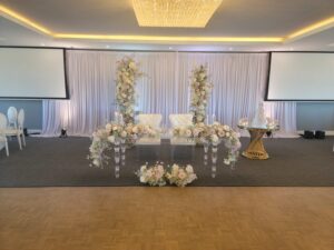 AllSouth-Asian WeddingsMiddle Eastern WeddingsWestern Weddings A Celebration of LoveRhythms of joy: The couple dances to the beat of celebration, encircled by the warmth of family and friends on their wedding day. Elegance in serenityElegance in serenity: A wedding venue awaits, draped in satin and soft hues, ready for a day of celebration and cherished moments. A throne for loveA throne for love: An opulent wedding stage set with floral grace and golden accents, where two hearts will unite in splendor. Crystal chandeliersA regal setting awaits: Crystal chandeliers and a backdrop of romance highlight the elegance of this wedding banquet hall, poised for a celebration. Modern Elegance Reception RoomSleek sophistication meets modern elegance: A wedding reception room dressed in white and bold purple, ready to welcome a night of celebration. Golf WeddingJoyride to happiness: The bride and groom share a playful moment on a golf cart, savoring their special day. A moment of love, a lifetime of happinessA moment of laughter and love: The newlyweds indulge in the sweet tradition of cake cutting, surrounded by elegance and joy.